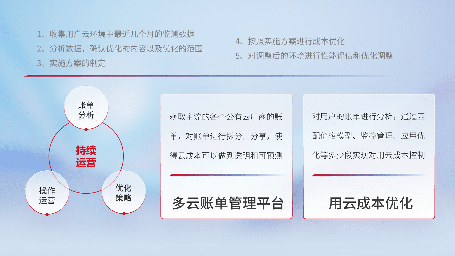 通过多云纳管,,,,以统一的资源数据模型把客户的云资源进行抽象和封装,,进而实现对多云资源的统一操作,,保障云资源管理的可靠性、、、稳定性与可用性。。。量身定制化运维内容,,,配置、、、开发运维、、、、补丁管理、、、备份、、监控、、、、认证和访问管理、、、审计和日常巡检等,,,保障在用云过程中的可靠度,,稳定度以及高可用率。。